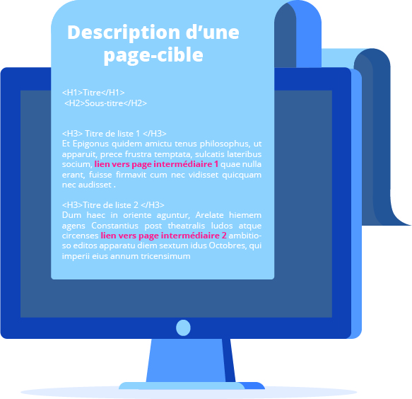 Les liens ne vont pas être les mêmes en fonction de la page sur laquelle ils se situent. En effet, au sein de la page cible, les liens doivent être dirigés vers des pages intermédiaires. Chaque lien doit se trouver dans un paragraphe distinct. Par conséquent, ce sont des liens descendants.